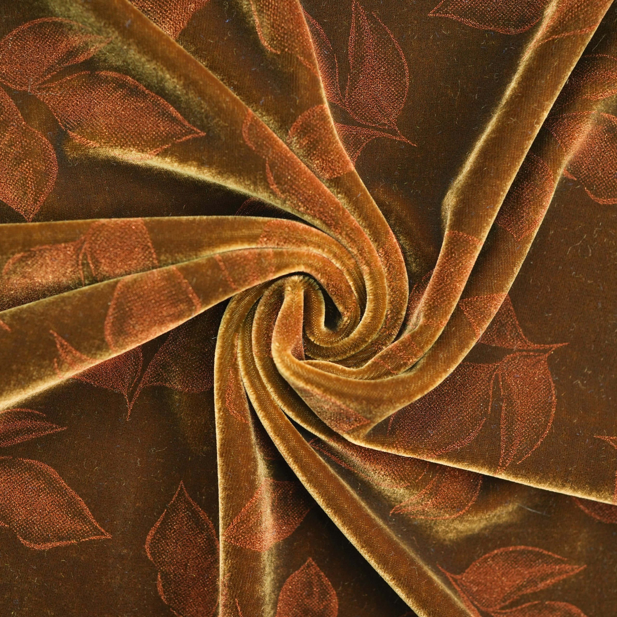 Silky velvet with pearlescent powder print combines luxurious texture with stunning metallic floral patterns. The shimmering pearl finish creates captivating color shifts, while the bronze foil detailing adds elegant dimension.